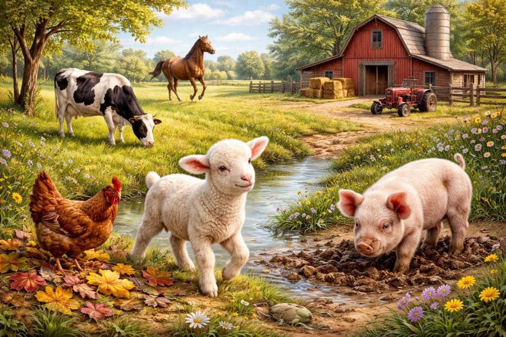 - Interactions entre animaux : des illustrations montrant des événements du quotidien, comme un cochon jouant dans la boue ou une vache dans un pré.